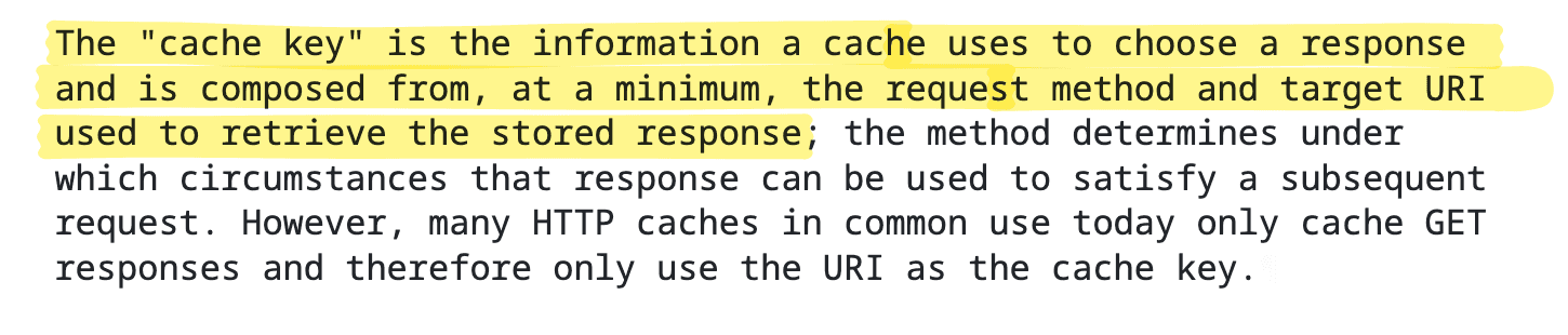 So yes, cache key requirements are relaxed - too relaxed and trusting for the sake of speed. The RFC leaves it up to developers and sysadmins to choose what belongs in the key based on their app’s context.