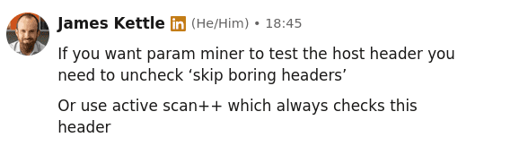 Note: Param Miner doesn’t test Host header by default, but the awesome James Kettle is on it.