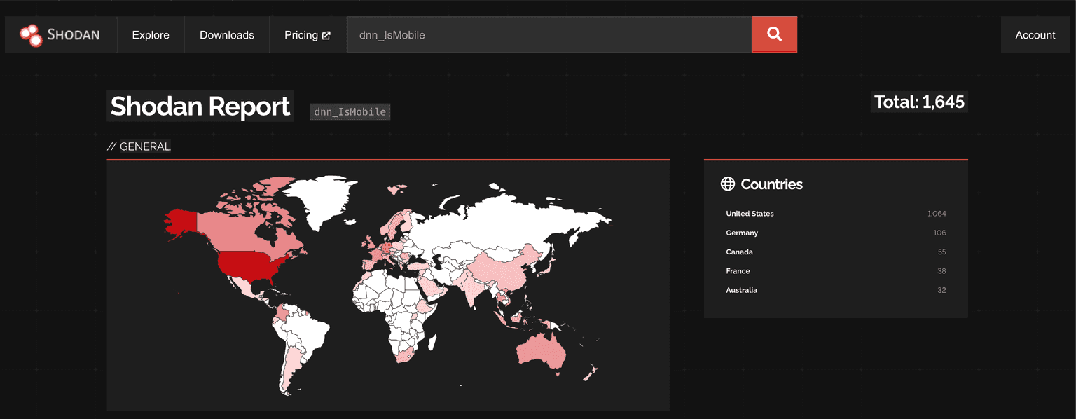By quickly asking our old friend Shodan for sites that set the cookie dnn_IsMobile, we get about 1645 servers exposed online (Apr 17, 2026):