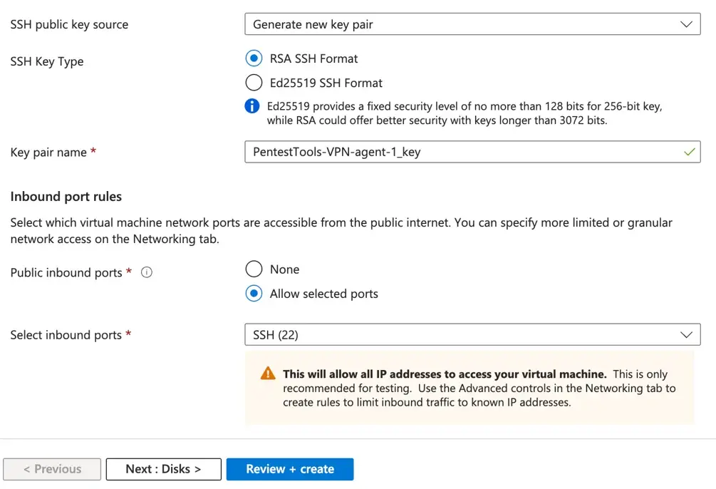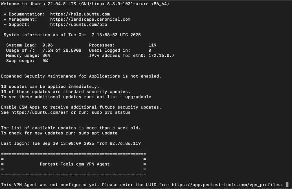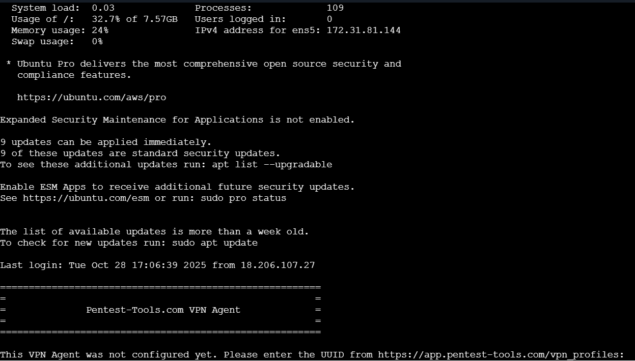 vpn2.pentest-tools.com. No inbound ports are required, though you may want SSH access (port 22 from your IP) for management.Activate the agent