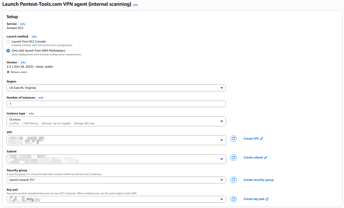 We recommend using One-click launch from AWS Marketplace. Choose your instance type (t3.micro or larger) and select the VPC and subnet where your targets are located.
