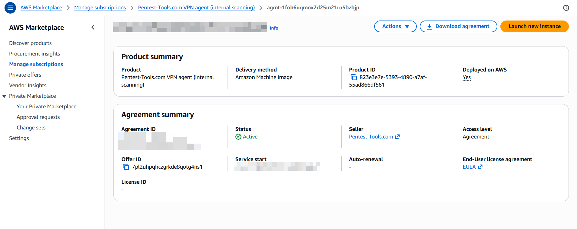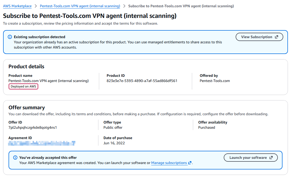 Go to the Pentest-Tools.com VPN Agent on AWS Marketplace and click View purchase options. If it’s the first time you are configuring the AWS VPN Agent, you have to Subscribe. If else, go directly and Launch your software.